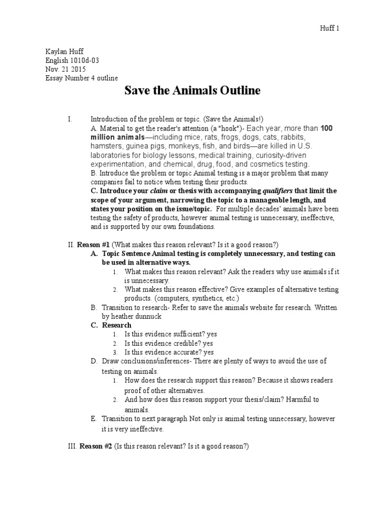 Here you make an inference of the whole essay without adding any new information. Here is an example of the outline for a pro-animal testing research paper:. To write a successful introduction, and the whole essay as well, you need to be aware of the topic. So first of all, you need to do a lot of research work for a good start.